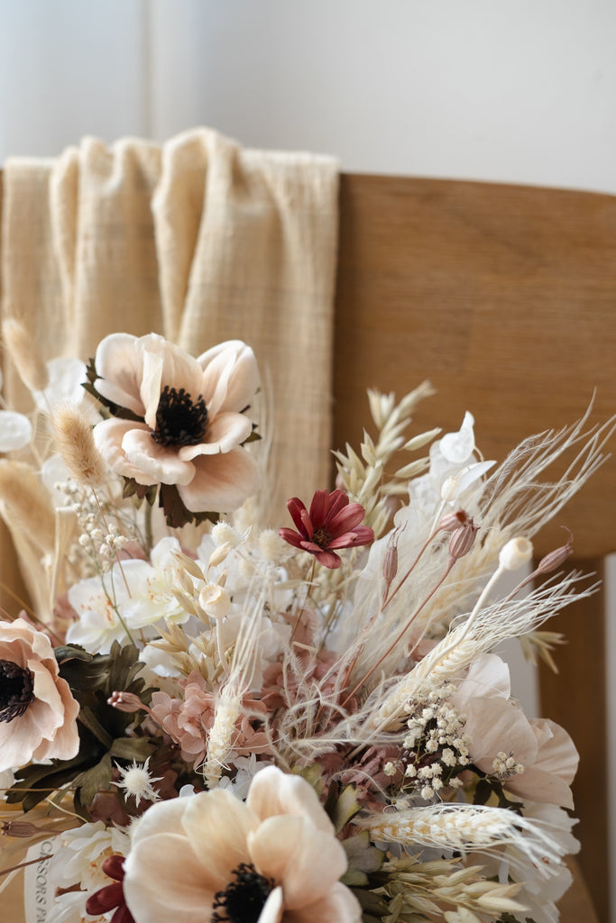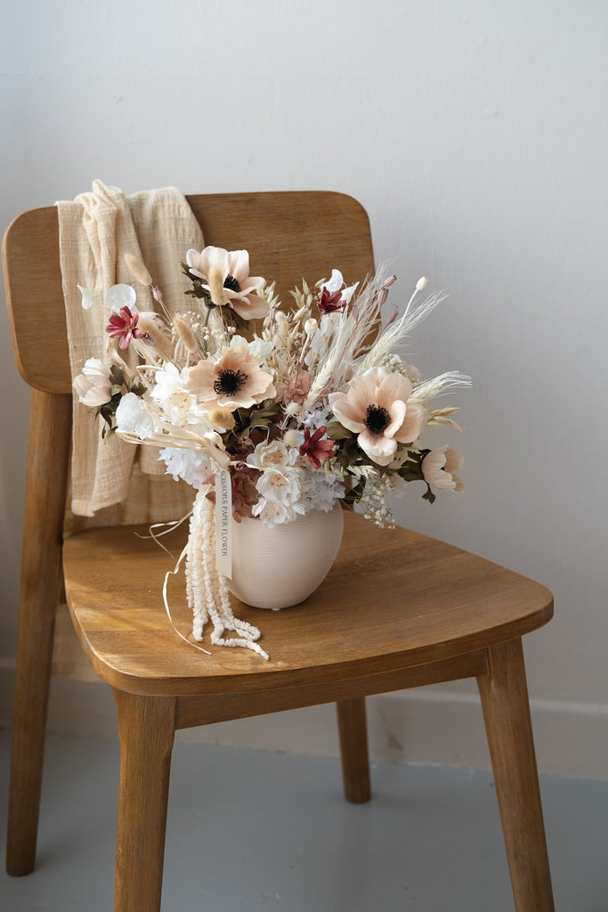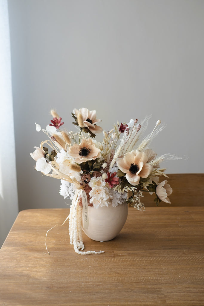 A gentle composition of beige, white, and brown blooms, crafted to bring calm and quiet elegance to any space. Made with preserved, dried, and faux flowers, this centrepiece is a lasting gift, carrying warmth and care in every petal.
