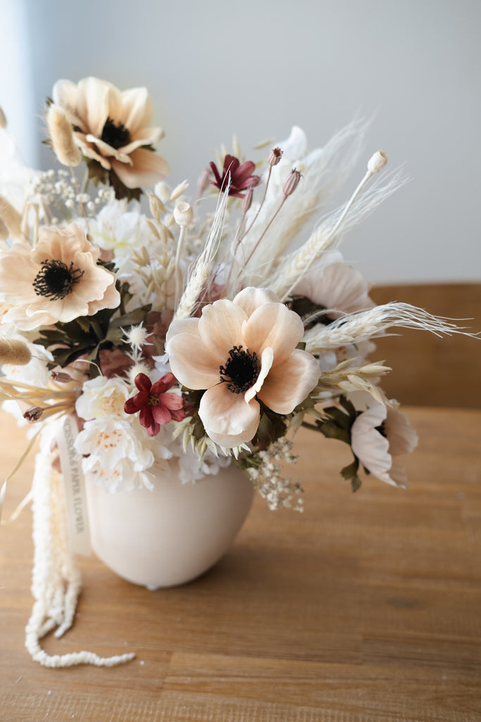 Flowers in Vase: Premium White Faux Sakura, Faux, Faux Poppies, Lunaria, Preserved Amaranthus, Preserved Hydrangea, Handmade Wood Flower, Faux and Preserved Filler Flowers.