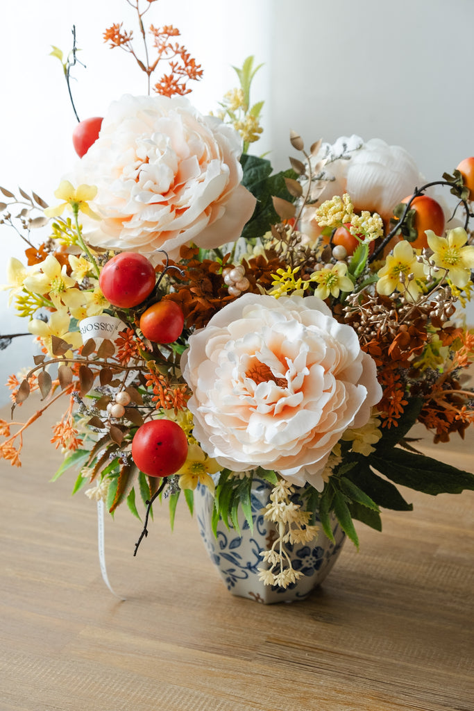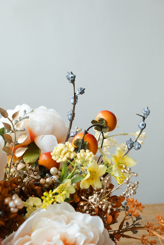 Premium Silk Peony, Silk Rice Flower, Faux Persimmons Fruits, Dried Eucalyptus Nuts, Preserved Hydrangea, Silk Gold Foliage, Preserved & Dried foliage and filler flowers.