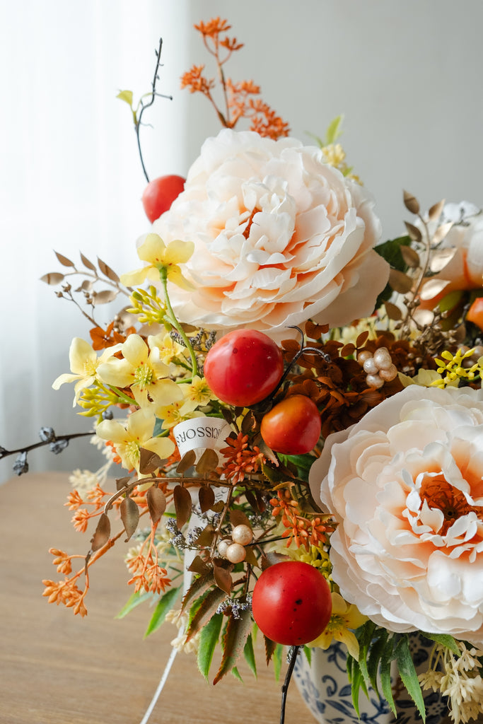 Welcome prosperity and joyful beginnings with Golden Flow 柿柿顺意 silk flower centrepiece. Soft champagne and vibrant yellow-orange tones, paired with cheerful faux persimmons, radiate happiness, success, and abundance. Handcrafted to last, this vase makes a thoughtful gift and a radiant centerpiece that brings warmth and festive charm to every corner of your home. To preserve its beauty, place it away from direct sunlight and windy areas.
