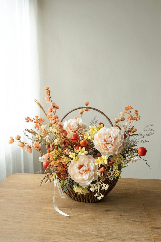 Bring the spirit of joy and prosperity into your home with the Golden Grace woven silk flower basket. Soft champagne hues meet vibrant yellow-orange tones, complemented by cheerful faux persimmons that symbolize happiness and abundance.