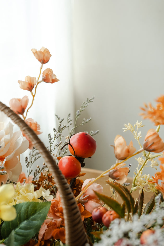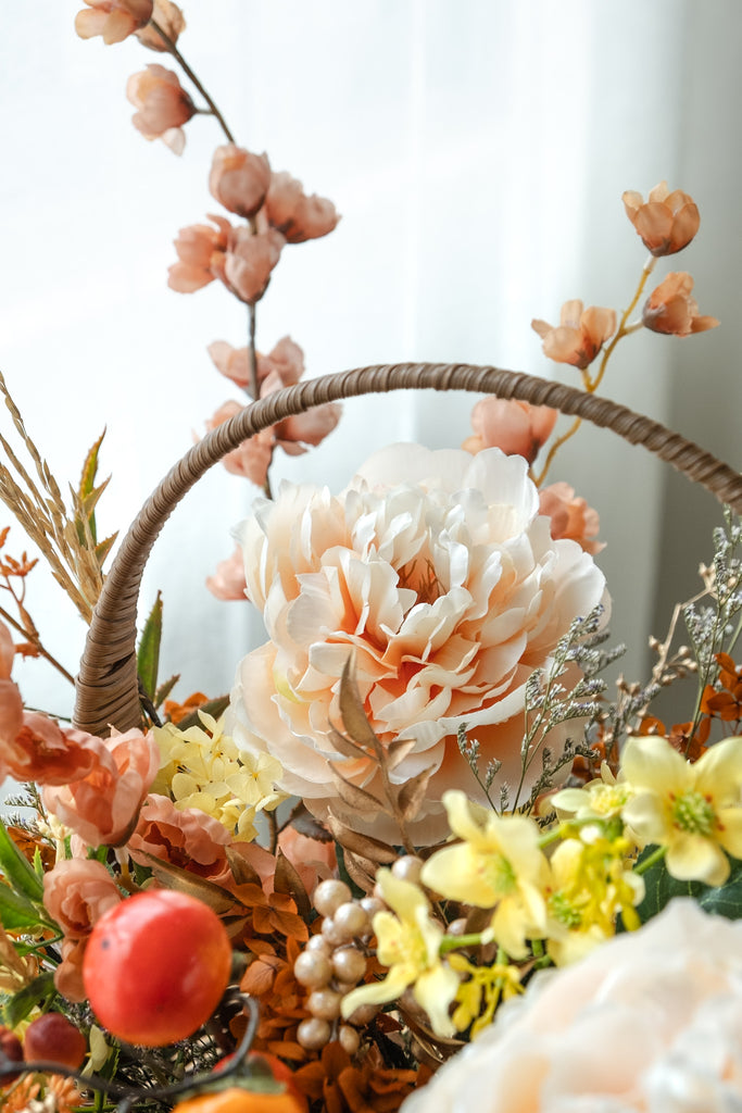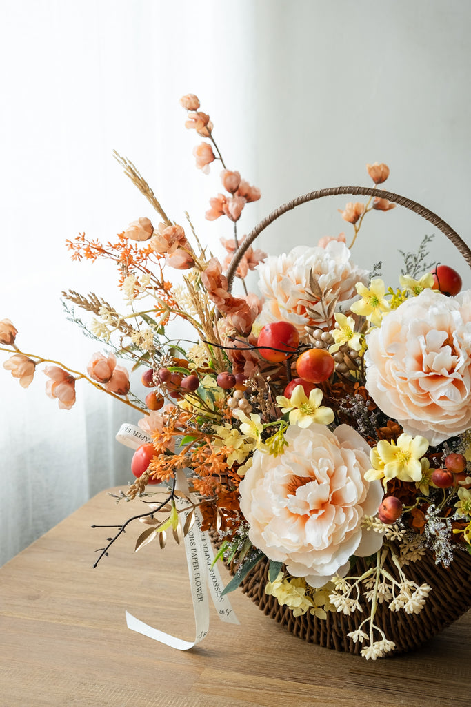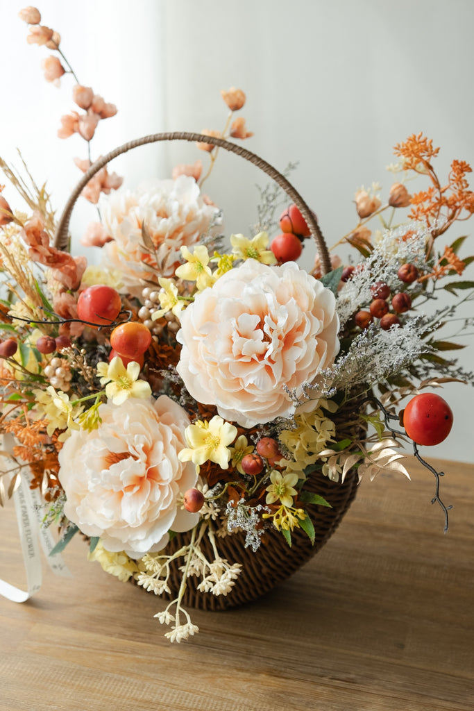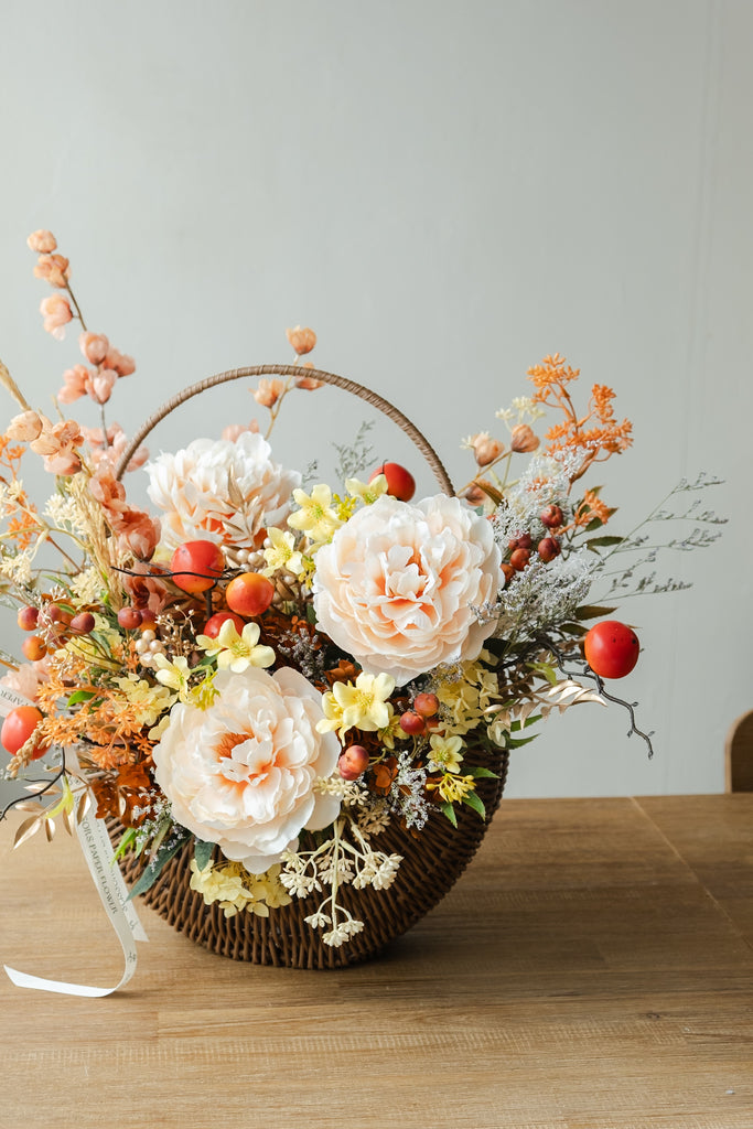 Premium Silk Peony, Silk Rice Flower, Faux Persimmons Fruits, Dried Eucalyptus Nuts, Preserved Hydrangea, Silk Gold Foliage, Preserved & Dried foliage and filler flowers.
