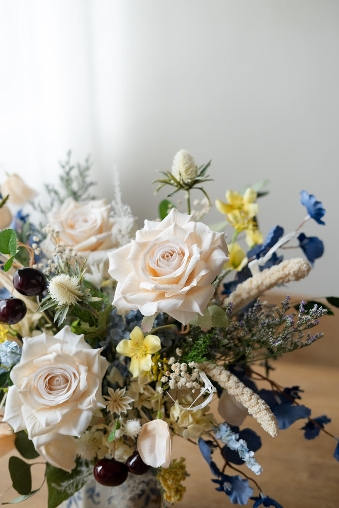 Bring serene sophistication to your home with Azure Bloom, handcrafted from silk, preserved, and dried flowers. Featuring blue silk dancing orchids, cream silk roses, and faux cherries in a blue floral vase, this long-lasting centrepiece adds timeless beauty to your Raya décor or festive gifting. Limited pieces available.