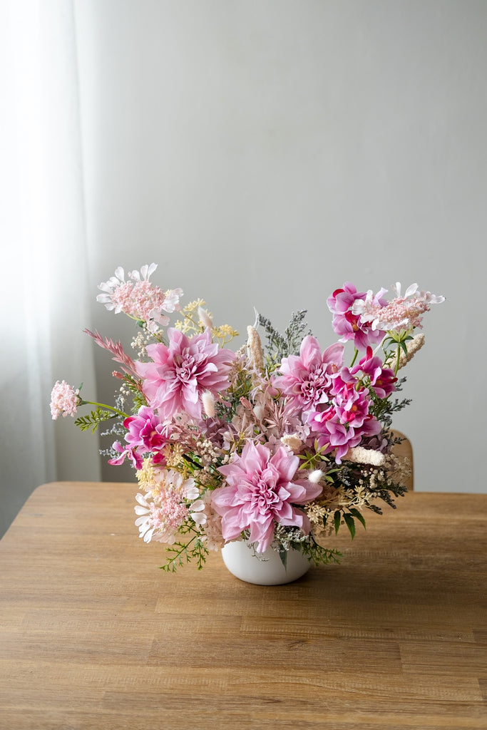 Soft, romantic, and feminine, Dahlia Grace showcases silk Dahlias, silk Queen Anne’s Lace, silk mini orchids, and preserved hydrangeas with faux fillers in pink and purple tones.