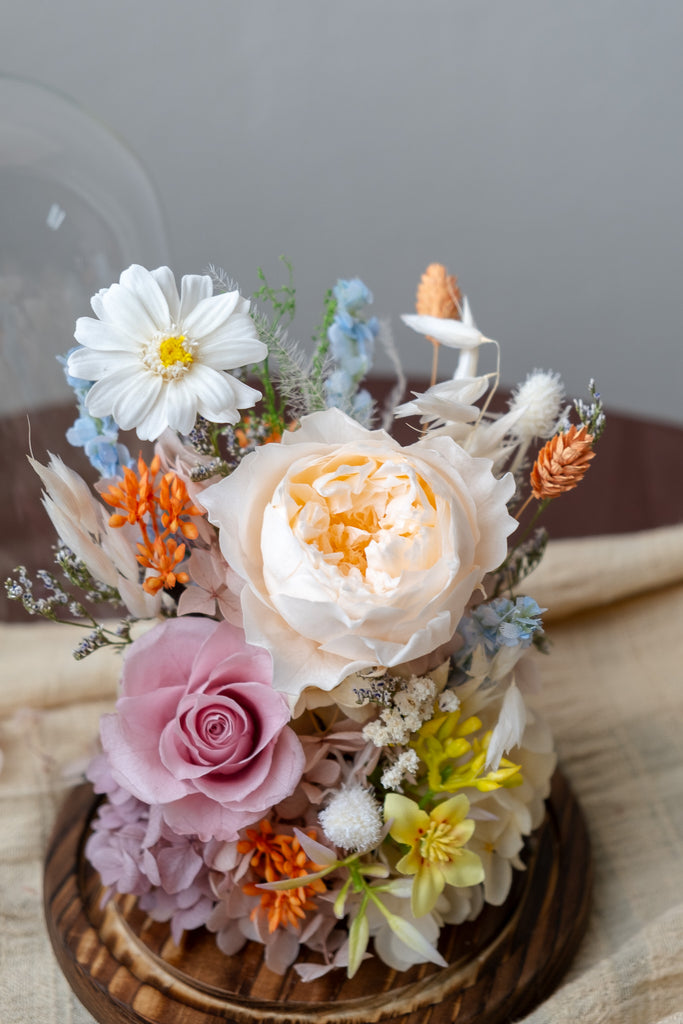 Flowers in Dome: Preserved Zinnia / Daisy, Preserved Garden Rose, Preserved Mini Rose, Dried Baby's Breathe, Preserved Hydrangea, Faux and Dried filler flowers.
